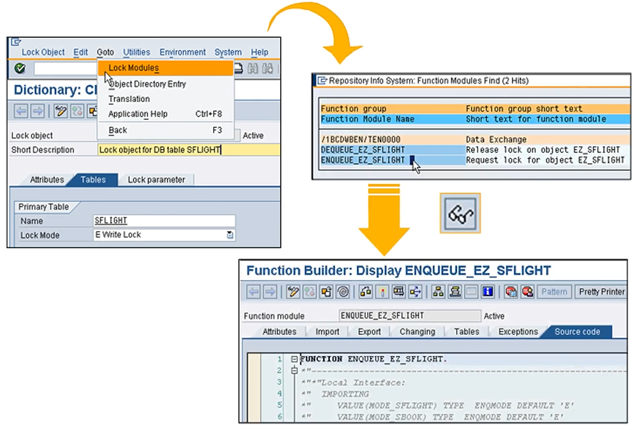 The lock modules have the following name convention: ENQUEUE_<Lock Object Name> or DEQUEUE_<Lock Object Name> .