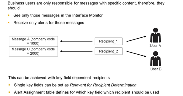 In some cases, users are only responsible for messages with specific content. In this case, they are notified only for messages that have the content they are responsible for. For example, for an interface for invoices, the users are only responsible for messages that belong to their company code. Then, they see only the messages of their company code in Interface Monitor and receive only notifications for errors in their company code. This can be achieved by defining key field dependent recipients.