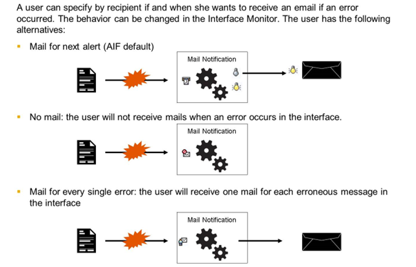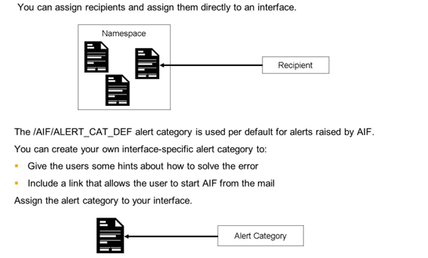 The /AIF/ALERT_CAT_DEF alert category is delivered with AIF. This category is used by default for sending notifications. In order to give the business users some more hints about the errors and how to handle them, you can create your own alert category (transaction ALRTCATDEF). If you define the container elements with the same names as in /AIF/ALERT_CAT_DEF, AIF passes those values to your own alert category as well. In this way, information, for example, the error messages and interface name, can also be passed to the users.