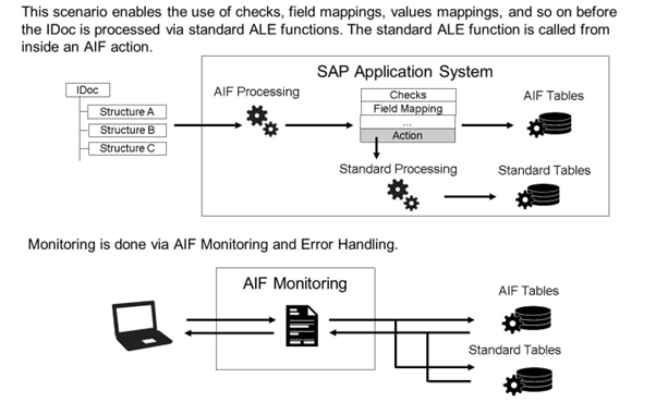 With scenario 2, the data from an IDoc is processed by AIF before the IDoc standard processing function is called from within an AIF action. In this scenario, you can use checks, value mappings, and alerting. Also, the Interface Monitor can be used.