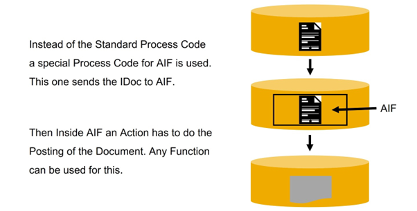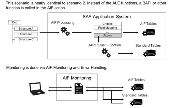With scenario 3, the data from an IDoc is processed by AIF before the IDoc processing is started from within an AIF action. The processing can be done in a function module, a BAPI, and so on. In this scenario, you can use checks, value mappings, and alerting. Also, the Interface Monitor can be used.