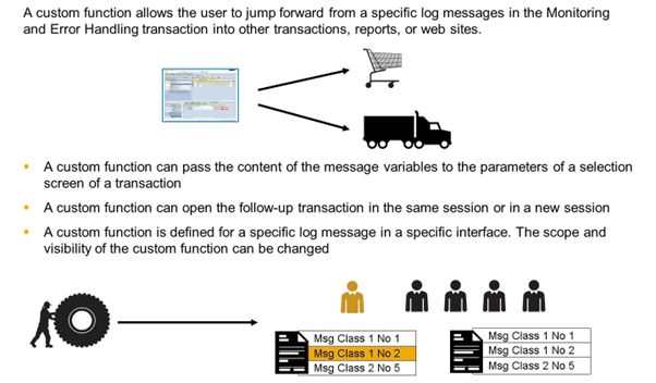 A custom function allows a user to jump into another transaction directly from the Monitoring and Error Handling transaction.