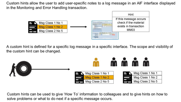 A custom hint allows a user to create notes with additional information, for example, what to do if a specific error occurs, next processing steps, and so on, for a specific log message in an interface. The hint displays in the Monitoring and Error Handling transaction if the users press the corresponding button in the Log Messages view.