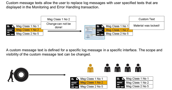 A custom message text allows a user to replace log messages with user specified texts, which are for a specific log message in an interface. Per log message, it is possible to have more than one custom message text. In the Log Messages view of Monitoring and Error Handling, the custom message text is displayed instead of the standard log message. If more than one custom message text is available for a specific log message, the newest custom message text is displayed in the Message Text column of the Log Messages view. To indicate that a custom message text was specified, an icon is displayed in the Texts column. A click on the icon opens a list of all available custom message texts for this log message. The displayed custom message texts are dependent on the user and the visibility and scope specified for the defined custom message texts.