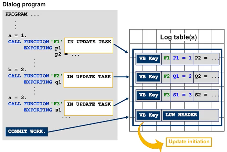 All the update requests in an SAP LUW are stored under the same update key (“VB key”). The update key is a unique worldwide identification code for an SAP LUW. Only when the system finds a COMMIT WORK statement will it create a header entry for the requests that belong together (log header) and then the unit is closed. The log header contains information on the dialog program that wrote the log entries, as well as information on the update modules to be executed. After the log header has been created, the dispatcher process is informed that there is an update package ready or available for processing.