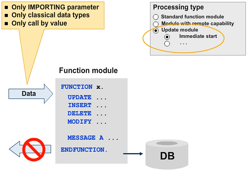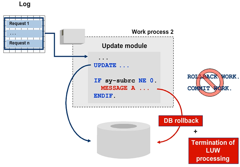 The task of an update module is to pass the requests for database updates to the database and to evaluate their return codes. To trigger a database rollback in the update module, issue a type “A” dialog message. The processing of the current SAP LUW will also be terminated. The log entry belonging to the SAP LUW is flagged as containing an error. The termination message is also entered in the log.
