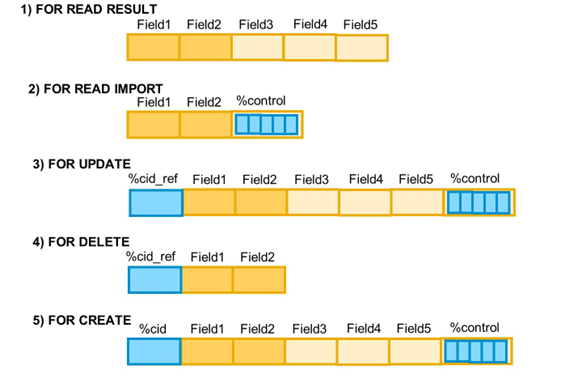 On the other hand, the types for Read, Import, Update, and Create contain a generated substructure of generic name %control. This substructure has as many components as there are fields in the RAP BO entity. The names of the components are identical to the fields in the entity but their data type is ABAP_BEHV_FLAG. % is used in certain cases to specify which fields are requested or provided.