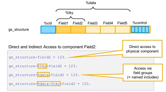 In the example in the figure, Component Groups in Derived Types, field2 is addressed directly as part of the named include %tky, and as part of the named include %data. Because %tky is part of %data, the field can even be addressed as component %tky of named include %data.