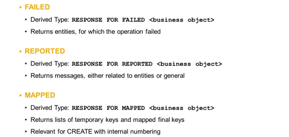 Responses are imported by adding keywords FAILED, REPORTED, or MAPPED to the EML statement. These keywords have to be followed by a deep structure of the related derived data type for the RAP BO root entity. The import of responses is optional.