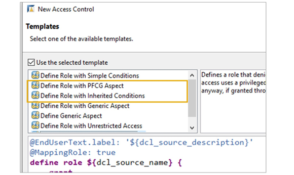 The Define Role with PFCG Aspect template is a blue print for an Access Control that defines conditions based on authorization objects.