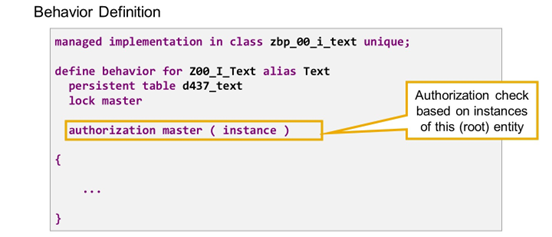 Authorization control in RAP protects your business object against unauthorized access to data. Authorization control is defined on entity level by adding authorization master ( instance ) or authorization dependent to the define behavior statement.