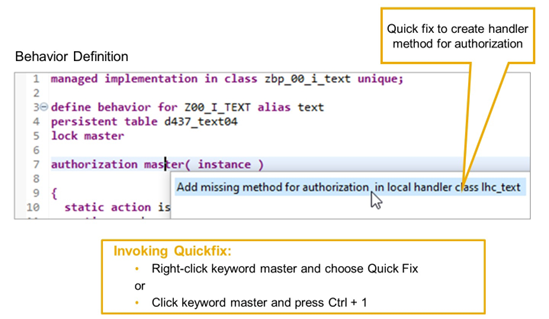 If the behavior definition contains the authorization addition when you create the behavior pool, the quick fix will automatically create the local handler class and the method or methods for authorization implementation.