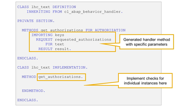 Authorization handler methods are defined with addition FOR INSTANCE AUTHORIZATION or with addition FOR GLOBAL AUTHORIZATION. The methods that are required depend on the behavior definition.