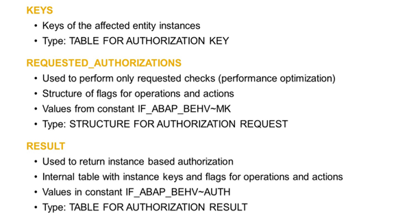 Like all handler methods, authorization handler methods require specific parameters that are supplied or evaluated by the RAP runtime framework. The types of these parameters are derived from the CDS data definition and the CDS behavior definition.