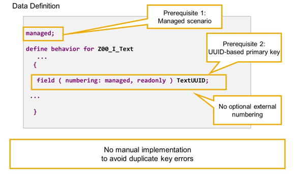 Internal numbering can either be managed or unmanaged. In Managed Numbering, the unique key is drawn automatically during the CREATE request by the RAP managed runtime. This is opposed to Unmanaged Numbering, where the key values are provided in a dedicated handler method, implemented by the application developer.