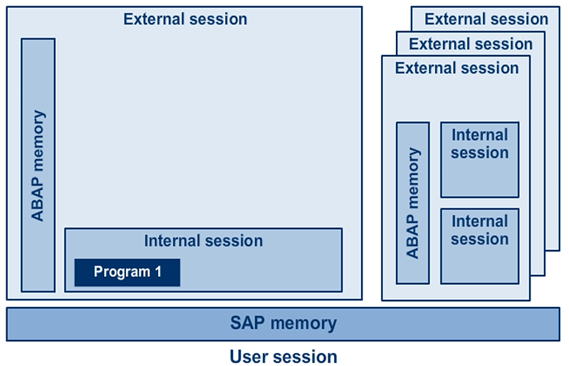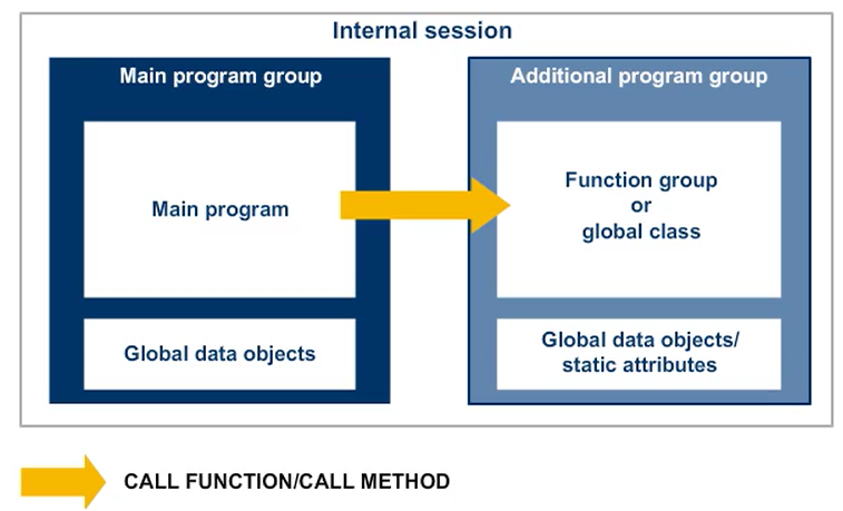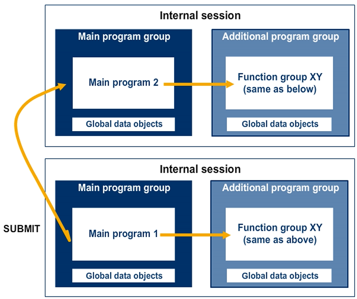 When two programs running in different internal sessions call up function modules from the same function group, the system loads the function group into each of the internal sessions separately. The system creates the global data of the function group separately in each internal session. Therefore, there is no possibility or risk of the two main programs exchanging data through the function group.