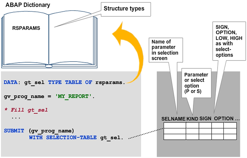 When you call executable programs dynamically, you can supply the selection screen with values by passing an internal table with the WITH SELECTION-TABLE addition. Define this internal table with the dictionary type RSPARAMS as the line type.