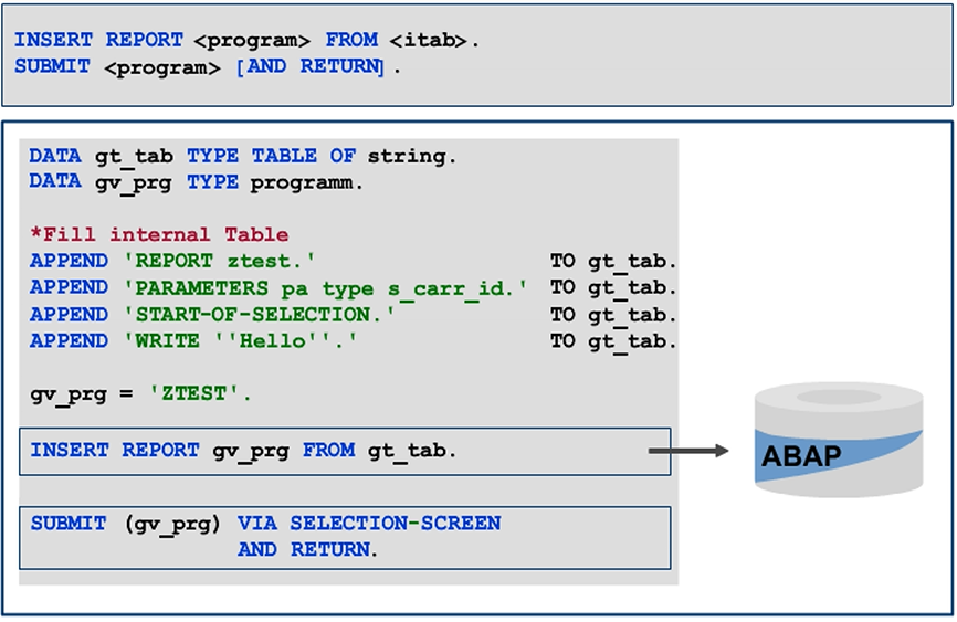The INSERT REPORT statement creates a program that is stored permanently in the Repository. To use this statement, fill an internal table with the source code that has a REPORT statement in the first line. Do not forget the period at the end of each ABAP statement.