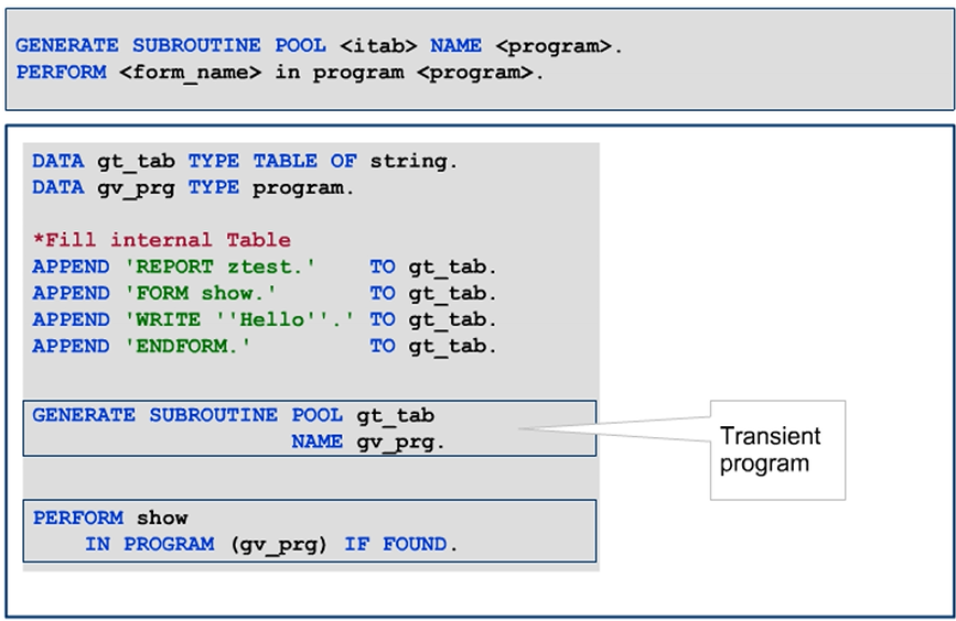 For more information about generating transient subroutine pools, see the ABAP help and look up keyword GENERATE.