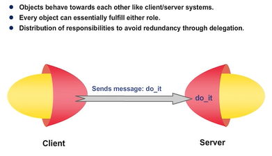 In object-oriented programming, the services are distributed among the objects in such a way that there are no redundancies and each object offers exactly those services it is responsible for. If an object needs any other services, it requests them from other objects. This concept is known as the principle of delegation.