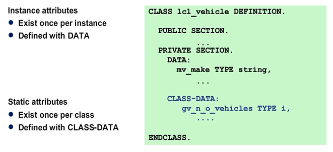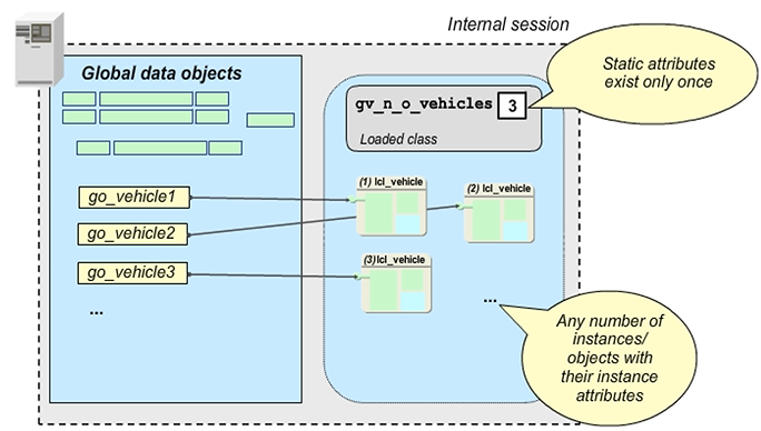 The figure shows how the GV_N_O_VEHICLES static attribute is related to other program elements in the memory. The static attribute exists only once in the loaded class, regardless of the number of instances of LCL_VEHICLE. Therefore, you can say that instances share static attributes.