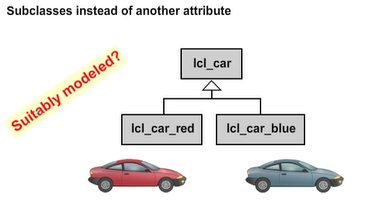 For example, a superclass called Car, contains the subclasses red Car, blue Car, and so on. The statement “A red car is a specific car” is correct only at first glance. However, there are no cars without color. At most, there are some cars that have not been painted. Therefore, every car needs the attribute color, assuming that it is relevant to the application. Therefore, that attribute must be defined in the superclass. There may be contradictions with reality when you try to implement a method for painting cars.