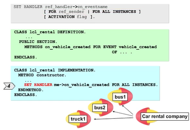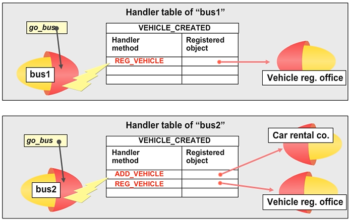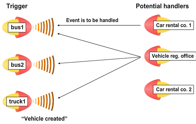 In this example, handler methods are defined for the event of the vehicle class, the car rental class, and the vehicle registration class. However, you can only predetermine which car rental instances and vehicle registration instances will react to which vehicle instance, and when they will do so.