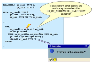 If the value range for data type I is exceeded in the calculation, the runtime system raises exception CX_SY_ARITHMETIC_OVERFLOW. This exception is handled in the implemented CATCH block. The reference to the appropriate instance is stored in data object GO_EXC in the example. The handler can access the instance’s exception text using the functional method GET_TEXT. The exception text is stored in the data object GV_TEXT with the type STRING and then displayed as an information message.