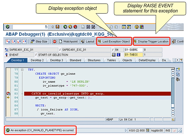 Hint: For performance reasons, the system does not actually create exception objects if the INTO addition is missing from the respective CATCH statement. In such cases, the Last Exception Object button normally does not appear.
