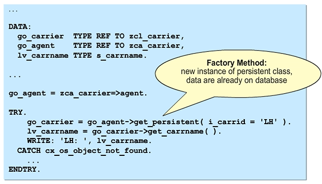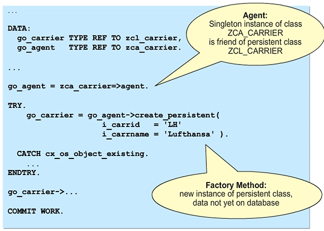 In the program, you need to define a reference variable with the type of the class actor and fill it with the reference from the static attribute AGENT. You can then create a new instance of the persistent class using its method CREATE_PERSISTENT. The ABAP developer creates its interface from the definition of the key attributes of the persistent class. If a persistent object of the same persistence class with the same key attributes already exists in the program, the class-based exception CX_OS_OBJECT_EXISTING is triggered. By default, the data is saved by an asynchronous update. You must start this process by using the COMMIT WORK statement. Thus, the instances of the persistent class do not become persistent objects until after that point.