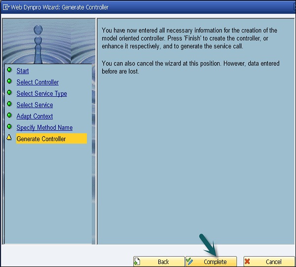 Step 9 − Click ‘Complete’ to create the controller, or enhance it respectively, to generate the service call.