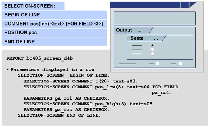 The COMMENT addition enables you to include text in the line. Comment texts must always have a format (position and output length). You can define the position using integer literals or variables. Pos_low and pos_high are the positions of the upper and lower limits of any SELECT-OPTIONS on the selection screen. The output length is always defined as an integer literal.