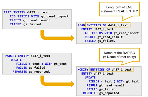 Statements READ ENTITY and MODIFY ENITITY are short forms of their longer versions READ ENTITIES OF and MODIFY ENTITIES OF.