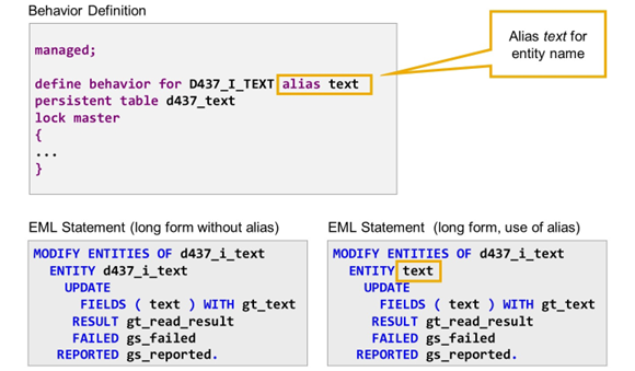 In behavior definition, the name of an entity is derived from the name of the related CDS view. In addition, you can provide an alias name for the entity. In the example, alias text is assigned to entity D437_I_TEXT.