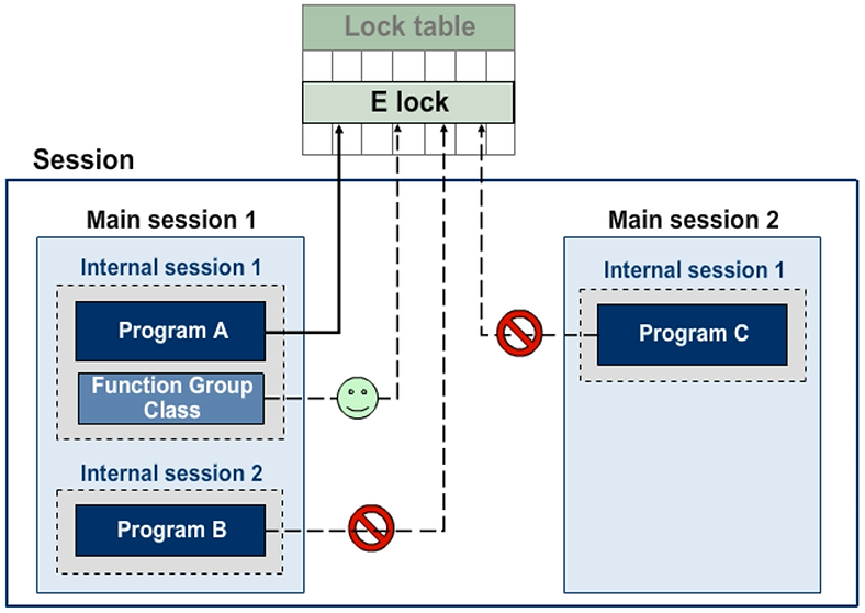 The system treats lock requests from the same user in different main sessions or terminal sessions as lock requests from different users. As shown in the figure, this is also the case for the same user, main session, and different INTERNAL sessions that are created by CALL TA or SUBMIT AND RETURN. This starts a new LUW and therefore, the accumulation is not possible, for example, for an E lock. In other words, accumulation, that is, to receive the same lock again, only works within the same LUW.