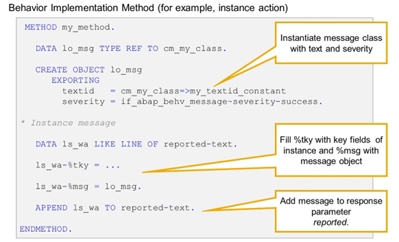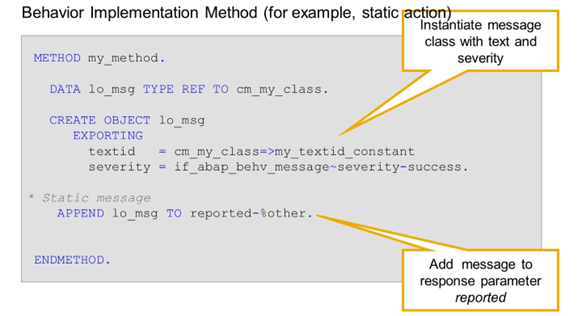 Certain behavior implementation methods, like, for example, action implementation methods and validation implementation methods, have an implicit response parameter reported. This parameter indicates that you can issue messages as part of the implementation. To do so, you have to create an instance of a message class, that is, a class that implements interface IF_ABAP_BEHV_MESSAGE, and store a reference to this instance in parameter reported.