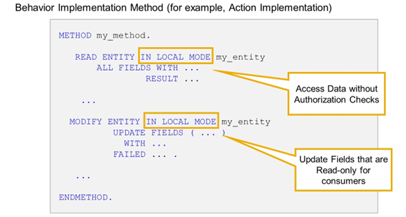 But there is an addition, IN LOCAL MODE, that can currently only be used in the RAP BO implementations for the particular RAP BO itself. That means that IN LOCAL MODE can only be used for this RAP BO's implementation classes in the behavior pool or other classes that are called from those implementation classes (for example, legacy code or other reused logic contained elsewhere).