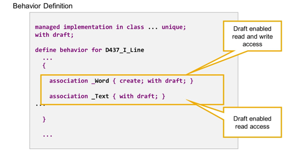 By adding with draft; inside the curly brackets, you specify that the association is draft-enabled. A draft-enabled association retrieves active data if it is followed from an active instance and draft data if it is followed from a draft source instance (for details about the draft concept, see CDS BDL - managed, with draft).