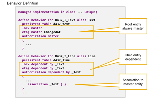 For child entities, syntax options lock dependent by etag dependent by and authorization dependent by are available, each followed by the name of an association, that points to the related master entity.
