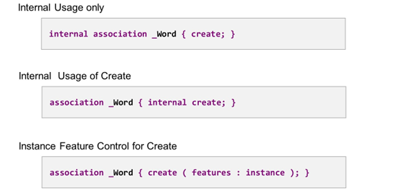 Several operation additions are available to restrict the usage of an association. If internal is placed before keyword association, read and create access are forbidden for an outside consumer of the business object. If it is placed within the curly brackets, before the keyword create, the create access is restricted, but read access is available for outside consumers.
