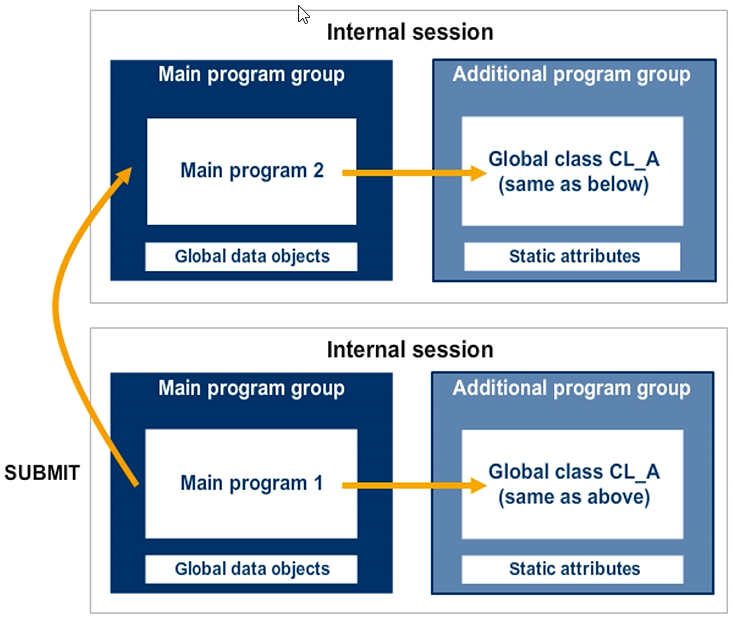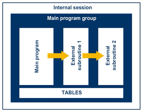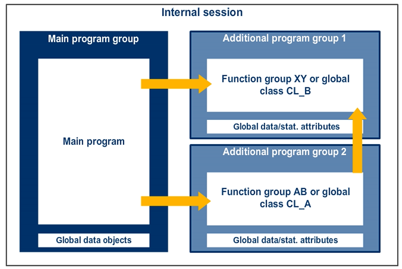 When two programs run in the same internal session, for example, an executable program and the AB function group it addresses, and both programs address the same XY function group, then the system loads the function group XY in the internal session once only. Therefore, the main program and function group AB can exchange data using function group XY. The same applies for global classes.