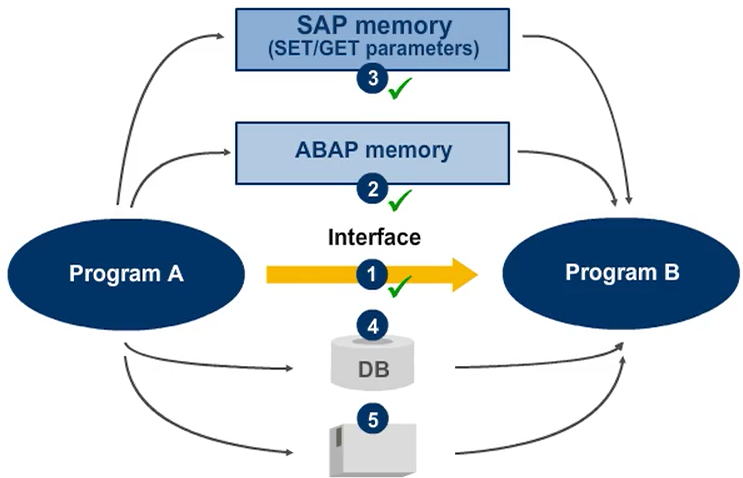 When you need to transfer data between two different programs but cannot specify the data as an addition in the program call, you can use SAP memory and ABAP memory to transfer data.