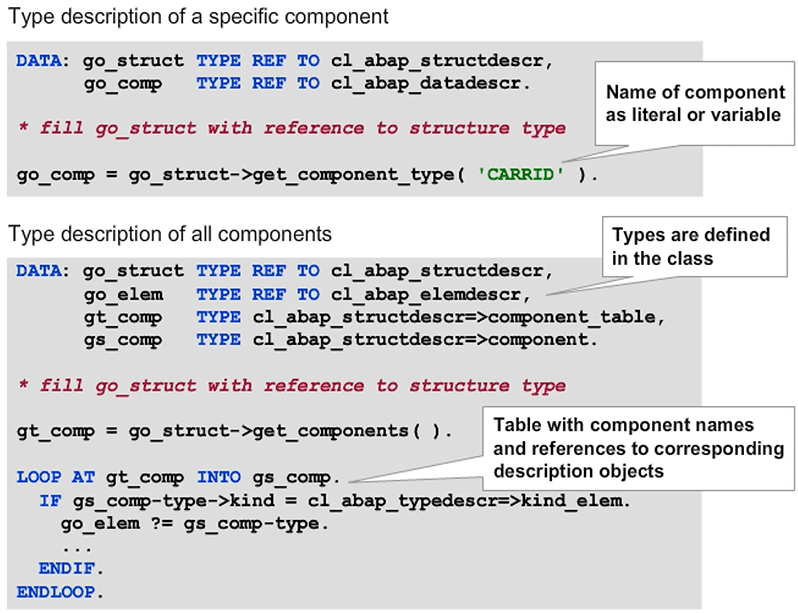 Hint: Because component types are also reference types, structure types, or table types, define the return values with type REF TO CL_ABAP_DATADESCR. A downcast to a subclass–typed reference variable may be necessary in reference variables, for example, to type REF TO CL_ABAP_ELEMDESCR.