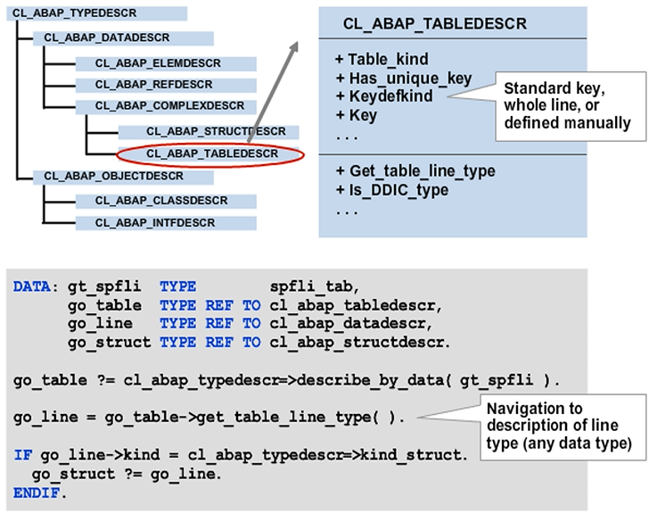 The public attributes of class CL_ABAP_TABLEDESCR include the table type (for example, standard, sorted, hashed, index, or any) uniqueness of the key, and a list of names of the key components. To determine the details for a line type, navigate to a description object for that line type using the GET_TABLE_LINE_TYPE navigation method.