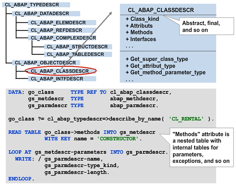 The figure demonstrates how to use RTTI to determine all the parameters of the constructor for class CL_RENTAL.