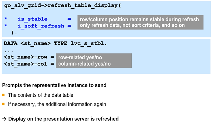 You can use the row and col fields of a structure of the lvc_s_stbl global data type to specify the condition that scroll positions for rows or columns are retained when refreshing (assign the value X to each field). Pass the corresponding filled structure to the is_stable parameter.