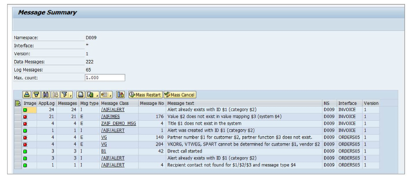 You can use mass restart and cancel functionality in the Message Summary. For example, if a user sees an error message that belongs to a logging problem, the user can select the message and restart the corresponding messages without needing to navigate to Monitoring and Error Handling, select the corresponding messages, and restart them.