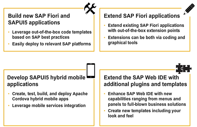 SAP Web IDE is a web-based development tool that simplifies the End-to-End application lifecycle in one tool, prototyping, development, packaging, deployment, and customer extensions optimized for SAP Fiori/SAPUI5 applications. It is powered by SAP Cloud Platform.