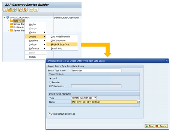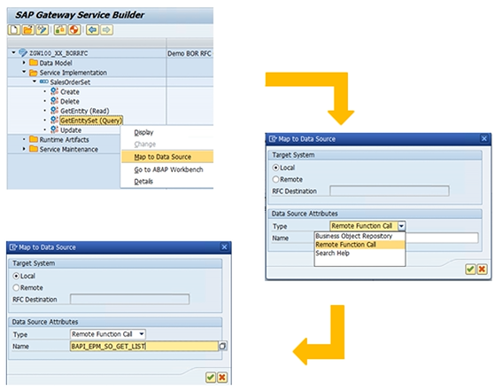The read method needs to be mapped to a different RFC function module. From the context menu of the GetEntity (Read) method entry, choose Map to Data Source. In the dialog box that opens, select the Remote Function Call data source type and enter the name of the RFC function module. In this case, enter BAPI_EPM_SO_GET_DETAIL to get the details of the sales order.