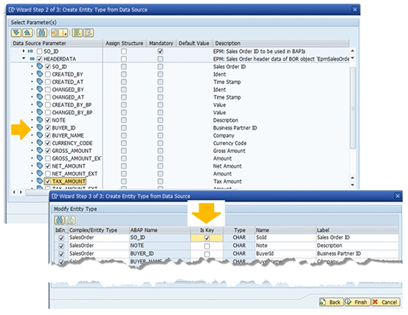 The entity type and entity set usually have to be renamed after the import of an interface of an RFC function module. This is because the generator doesn’t take the name of the entity type that has been chosen in the first screen. The reason for this behavior is that the wizard allows you to import several interfaces at once. The first screen, however, only allows you to choose one name.